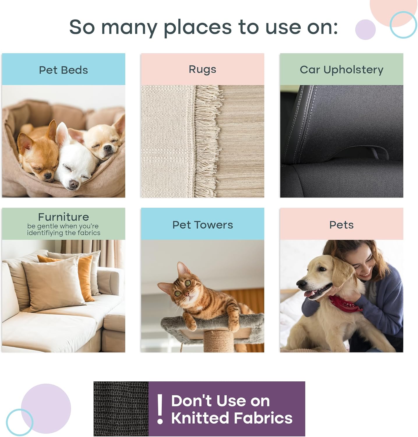 You can use them on anything non-knitted and delicate, like carpets, rugs, stairs, sofas, couches, cat towers, pet beds, fleece blankets, etc. Use gently before identifying the fabric!